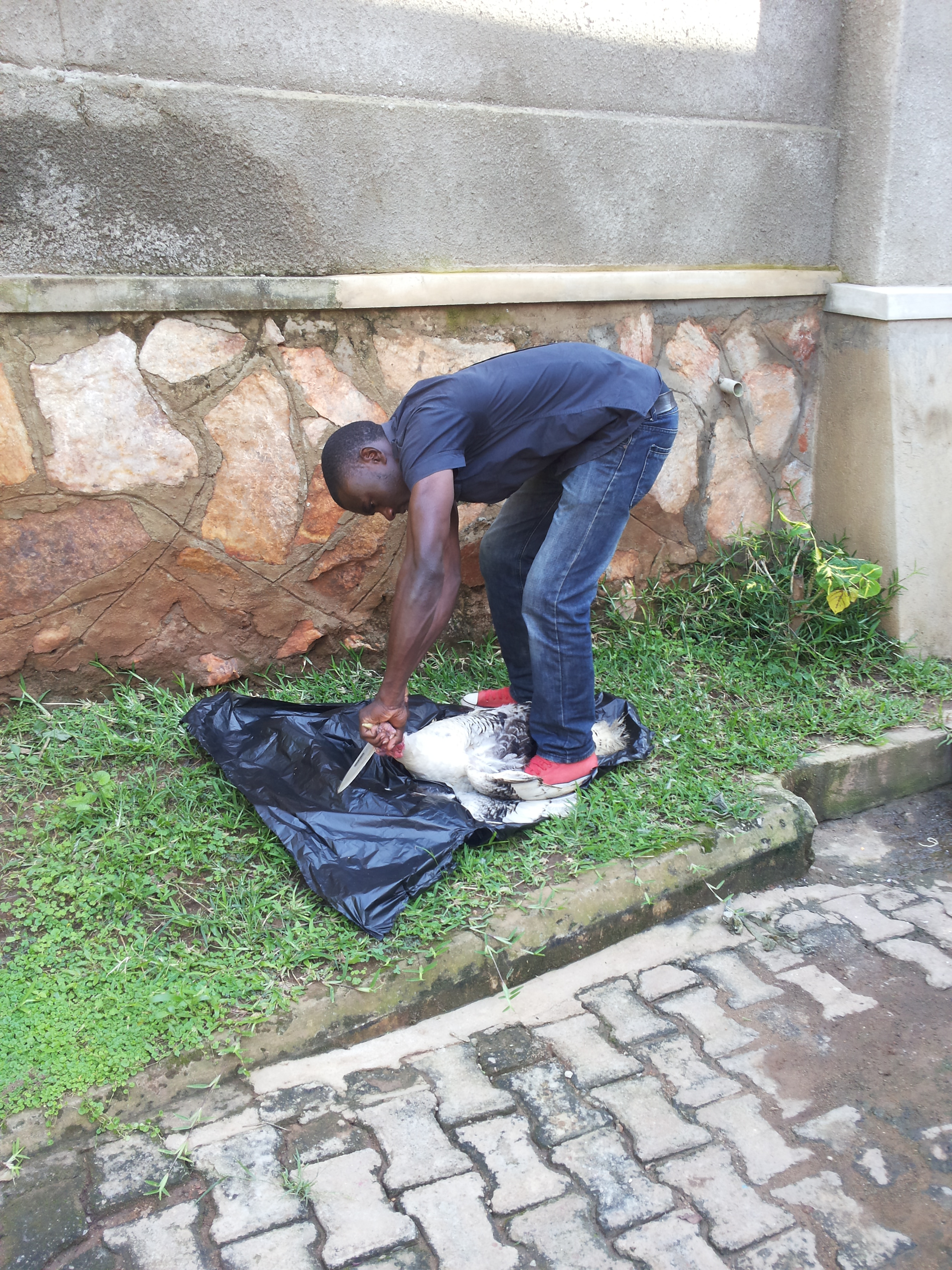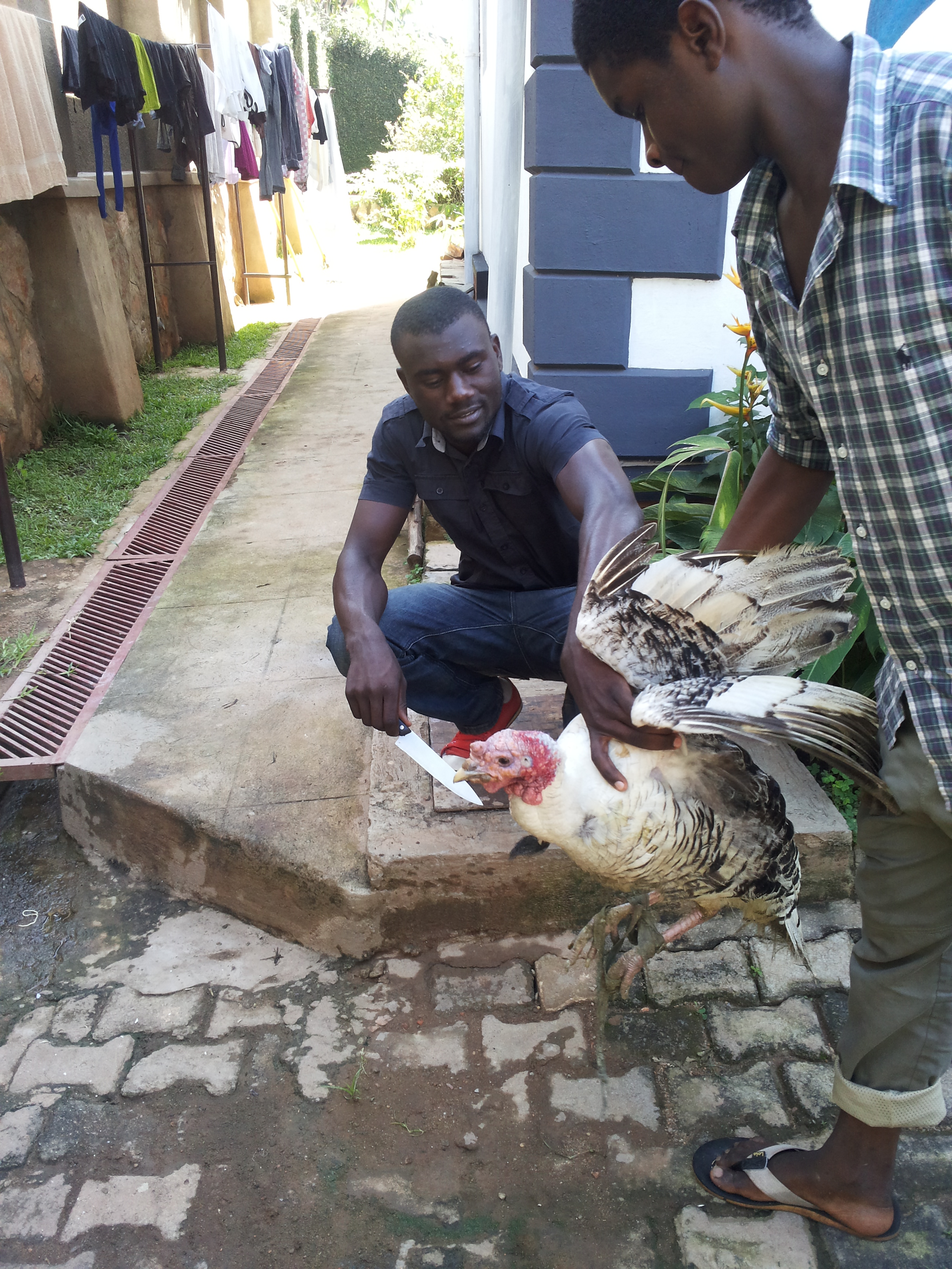 Of course when I bought the bird, I knew slaughtering it would be a challenge so I inquired with several people and was able to find someone willing to come to my house to take care of business (which was AWESOME because the idea of carrying a live turkey on the back of a bodaboda, or mototaxi, was only amusing if I was not the poor sucker who had to do it). I thought I had everything set, including the boiling water for the defeathering, when I realized: I still have to carry the turkey from its coop to its sacrificial resting place. I stood there like an idiot staring at the turkey wondering what call I could make to entice it closer to the door, with absolutely no idea what to do next once it was within arm’s reach. Fortunately, I was saved by our guard who grabbed the turkey by its wings and carried it to the back of the house.